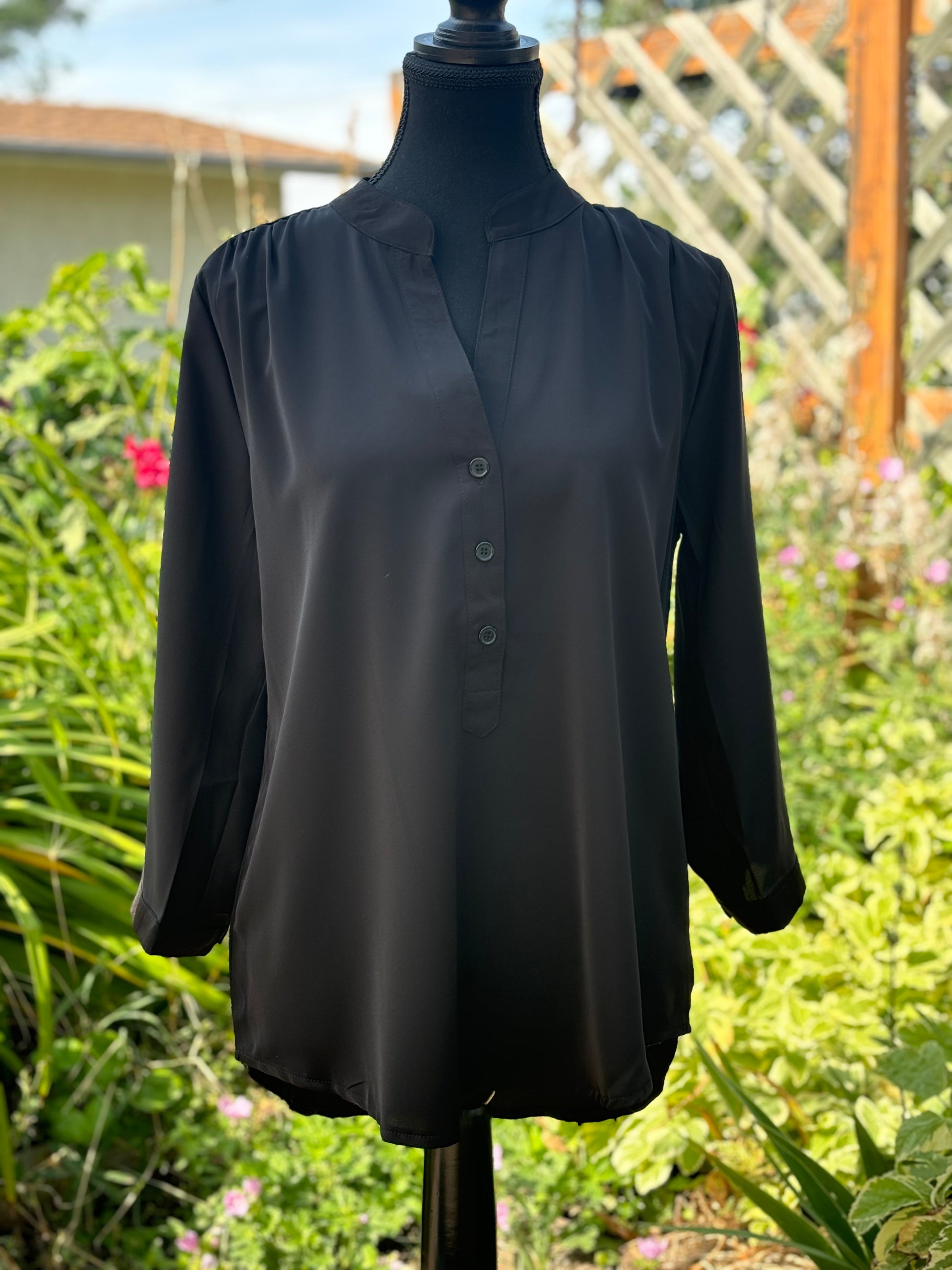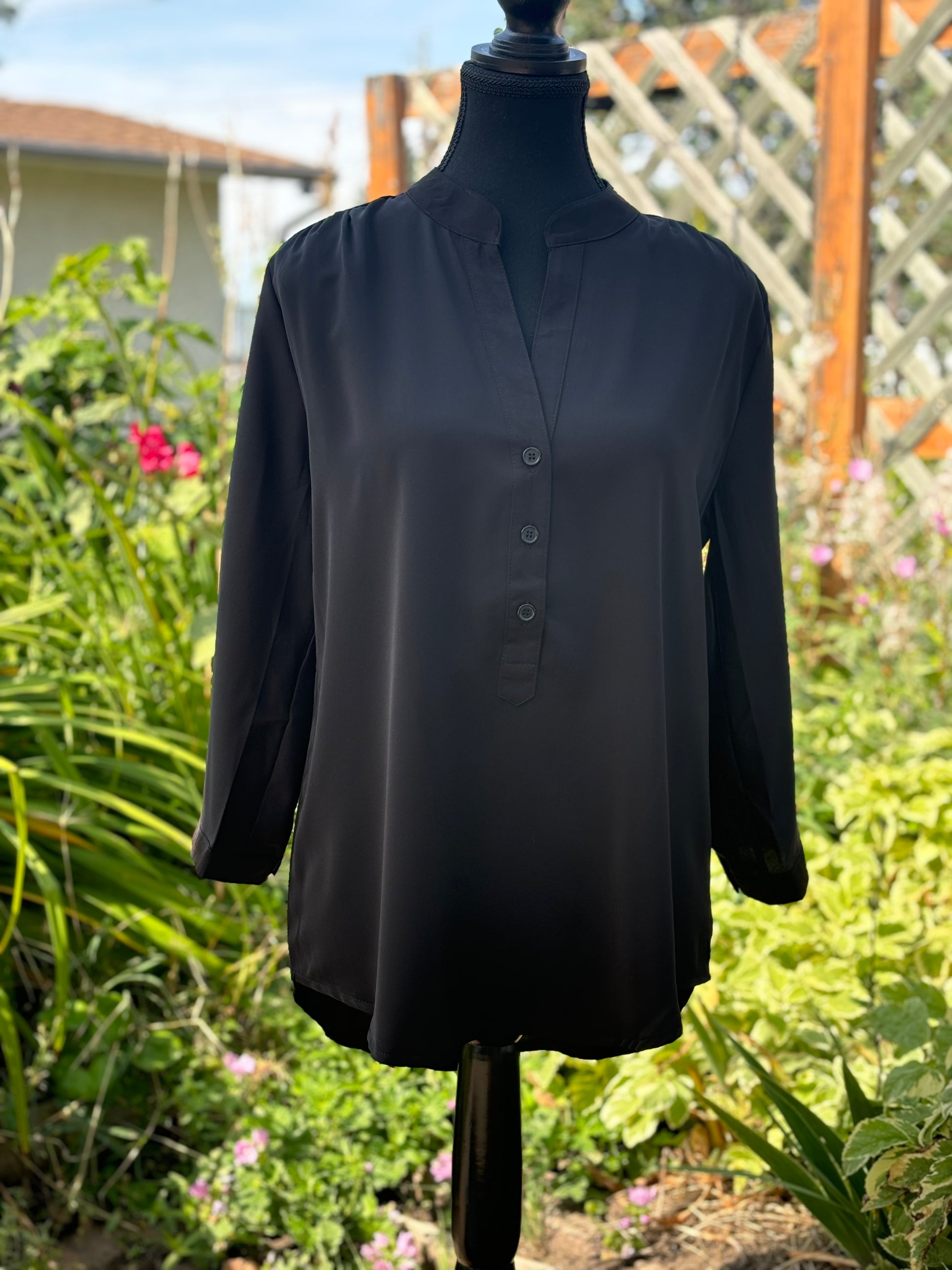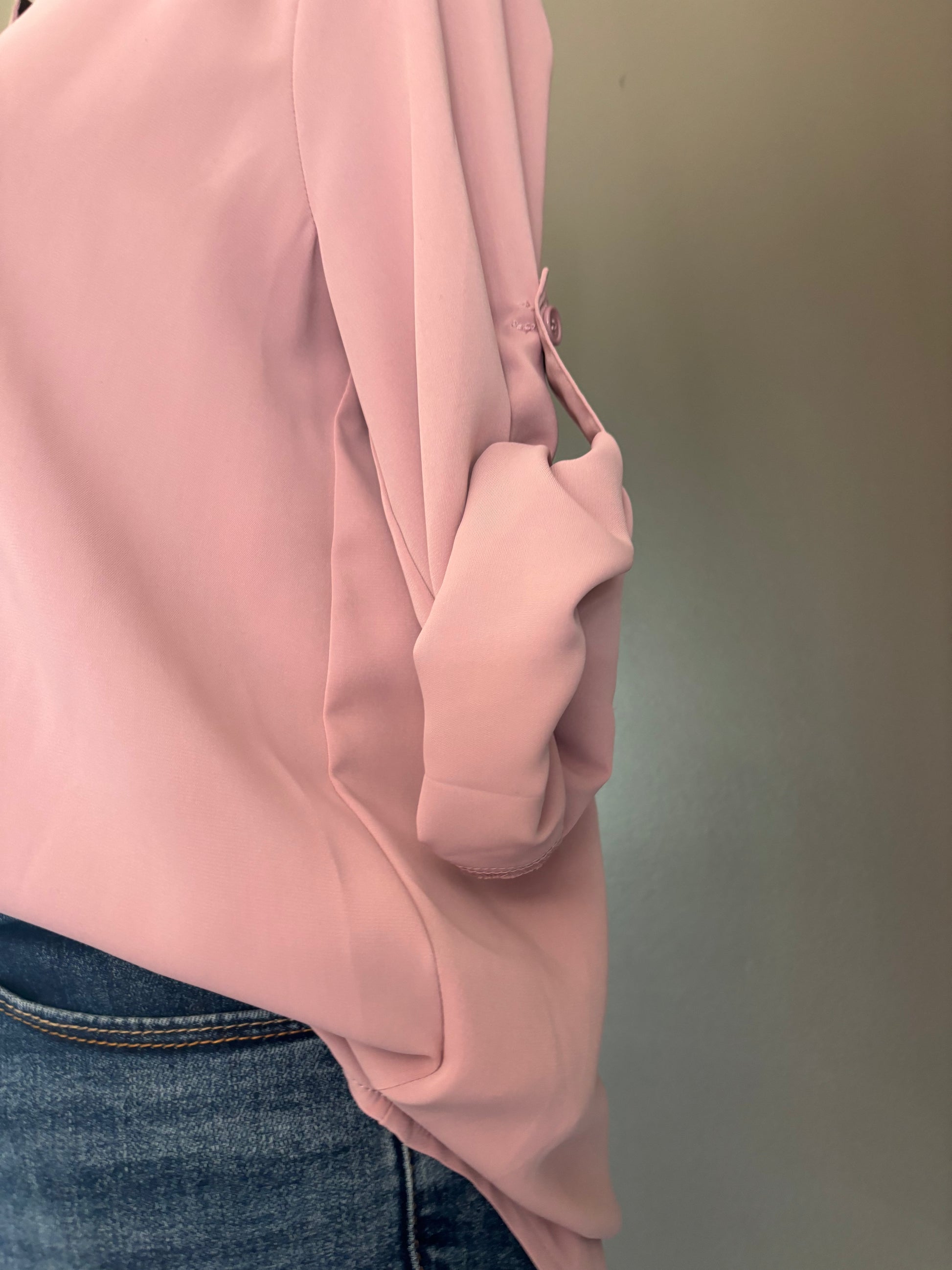 Made from a polyester blend material that has a soft satin feel, this blouse is the perfect balance for a business casual look. The longer round hem in the back and shorter front makes it the perfect top for tucking into your pants, creating a sleek and polished look. The 3/4 length sleeves feature a tab that allows you to cinch them up for a more casual and playful style. With button detailing in the front, this blouse is versatile and can easily transition from a day at the office to a night out on the town. Elevate your wardrobe with the Bianca Blouse.