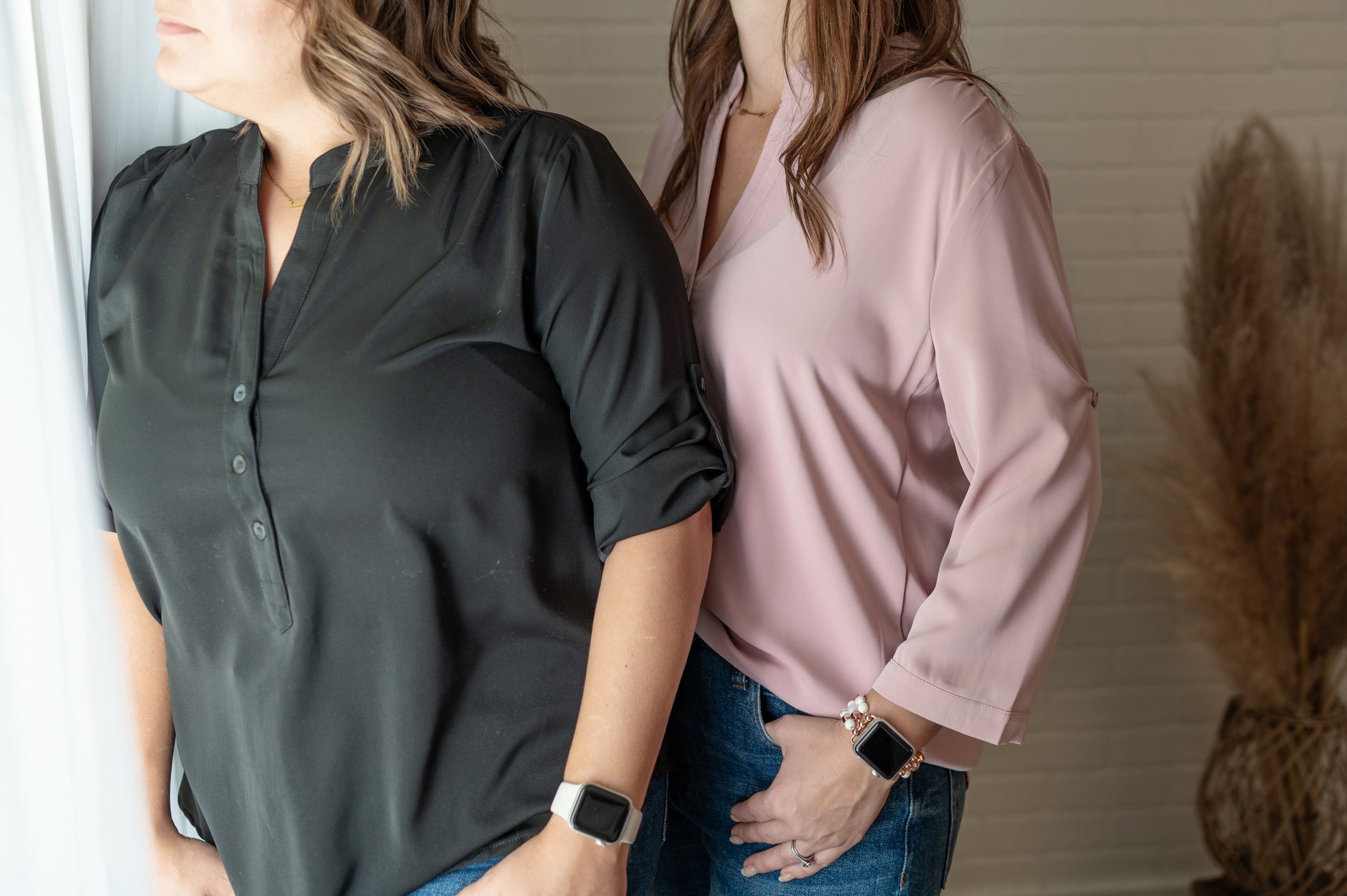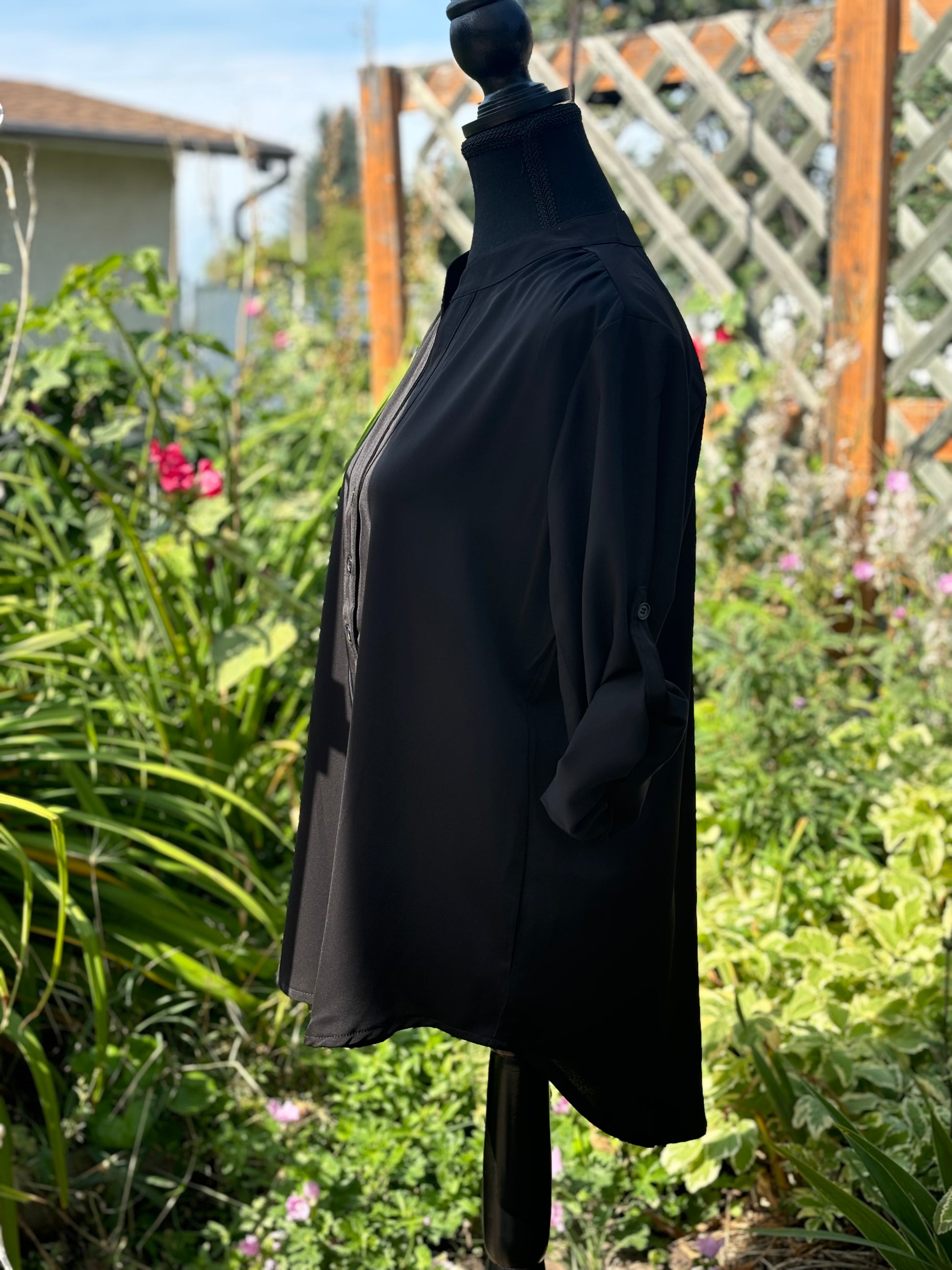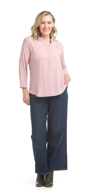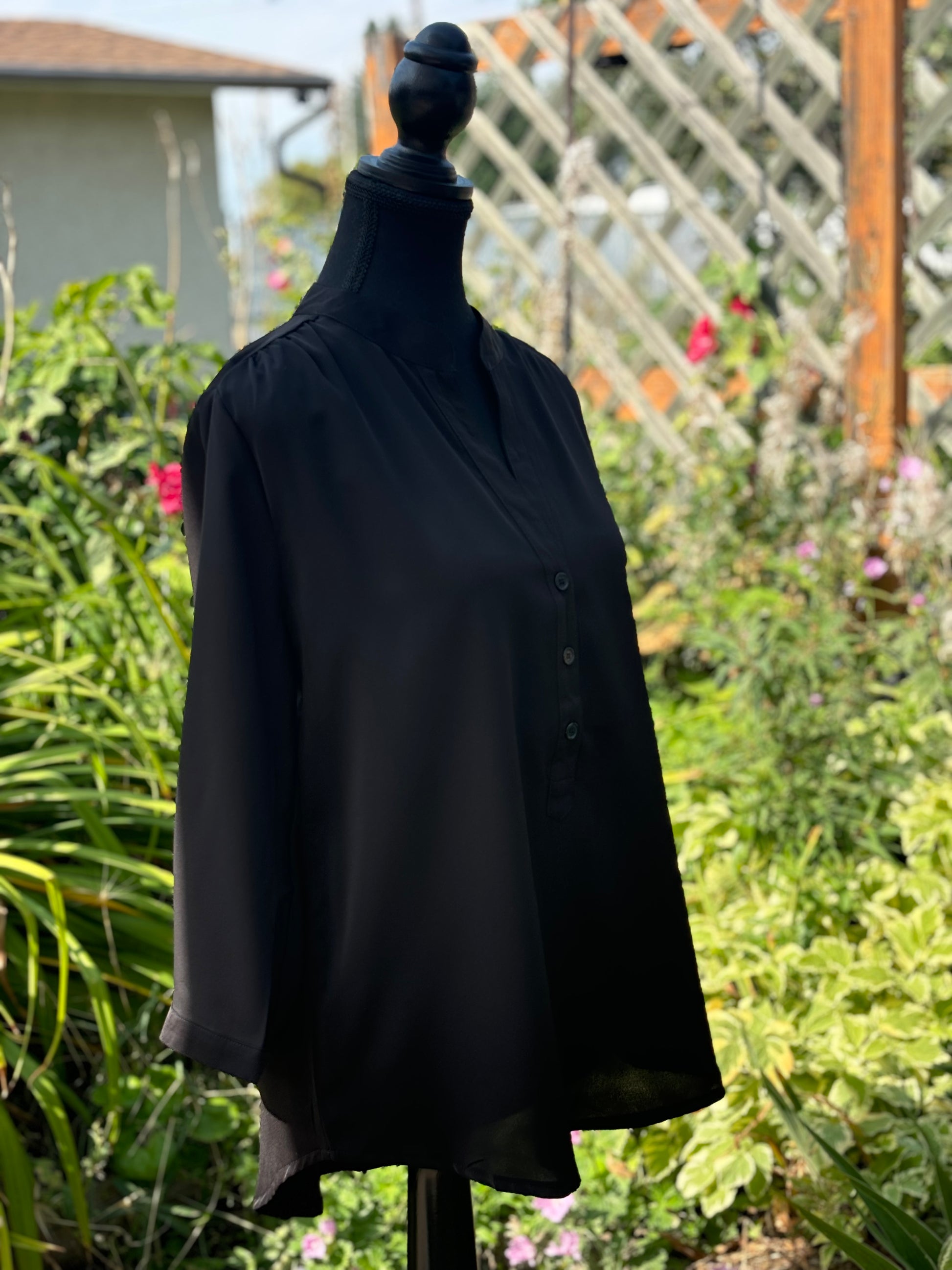 Made from a polyester blend material that has a soft satin feel, this blouse is the perfect balance for a business casual look. The longer round hem in the back and shorter front makes it the perfect top for tucking into your pants, creating a sleek and polished look. The 3/4 length sleeves feature a tab that allows you to cinch them up for a more casual and playful style. With button detailing in the front, this blouse is versatile and can easily transition from a day at the office to a night out on the town. Elevate your wardrobe with the Bianca Blouse.