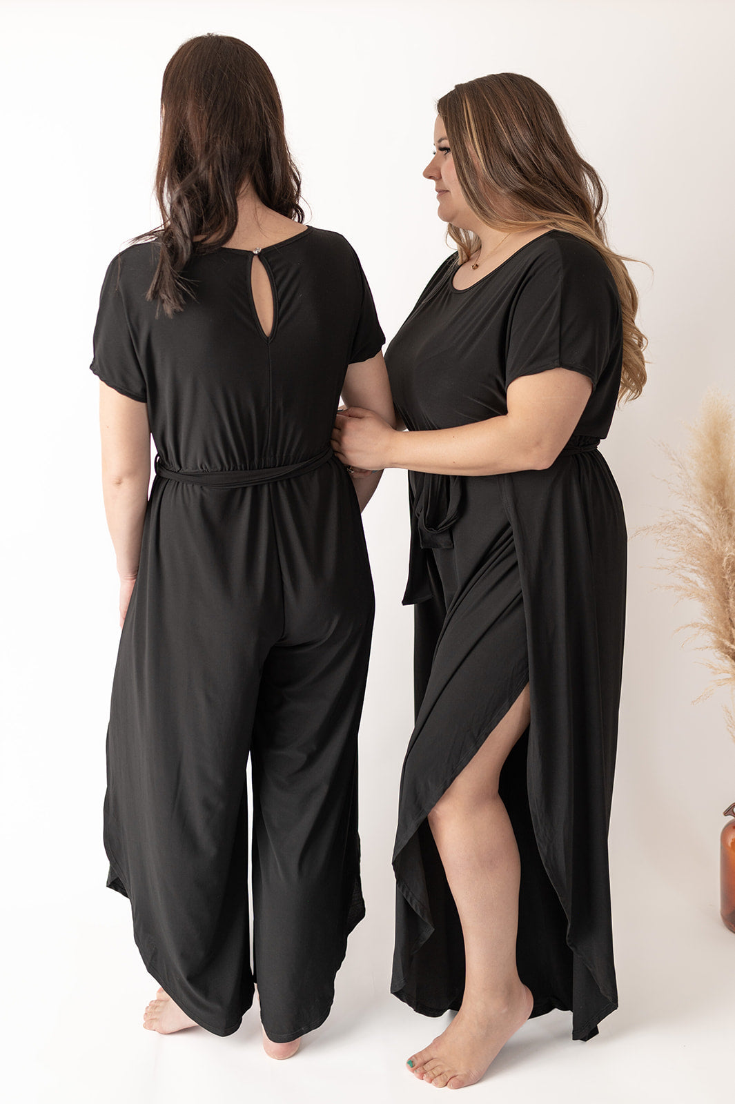 The cora jumpsuit has a half-sleeve and a boat neck. It features an adjustable waist tie and a true-to-size fit. The fabric has a lightweight and silky feel. The leg slits make it flowy and dressy, while the spandex makes it durable. Pair it a blazer to wear to the office and swap out for a jean jacket to go for drinks on the weekend.