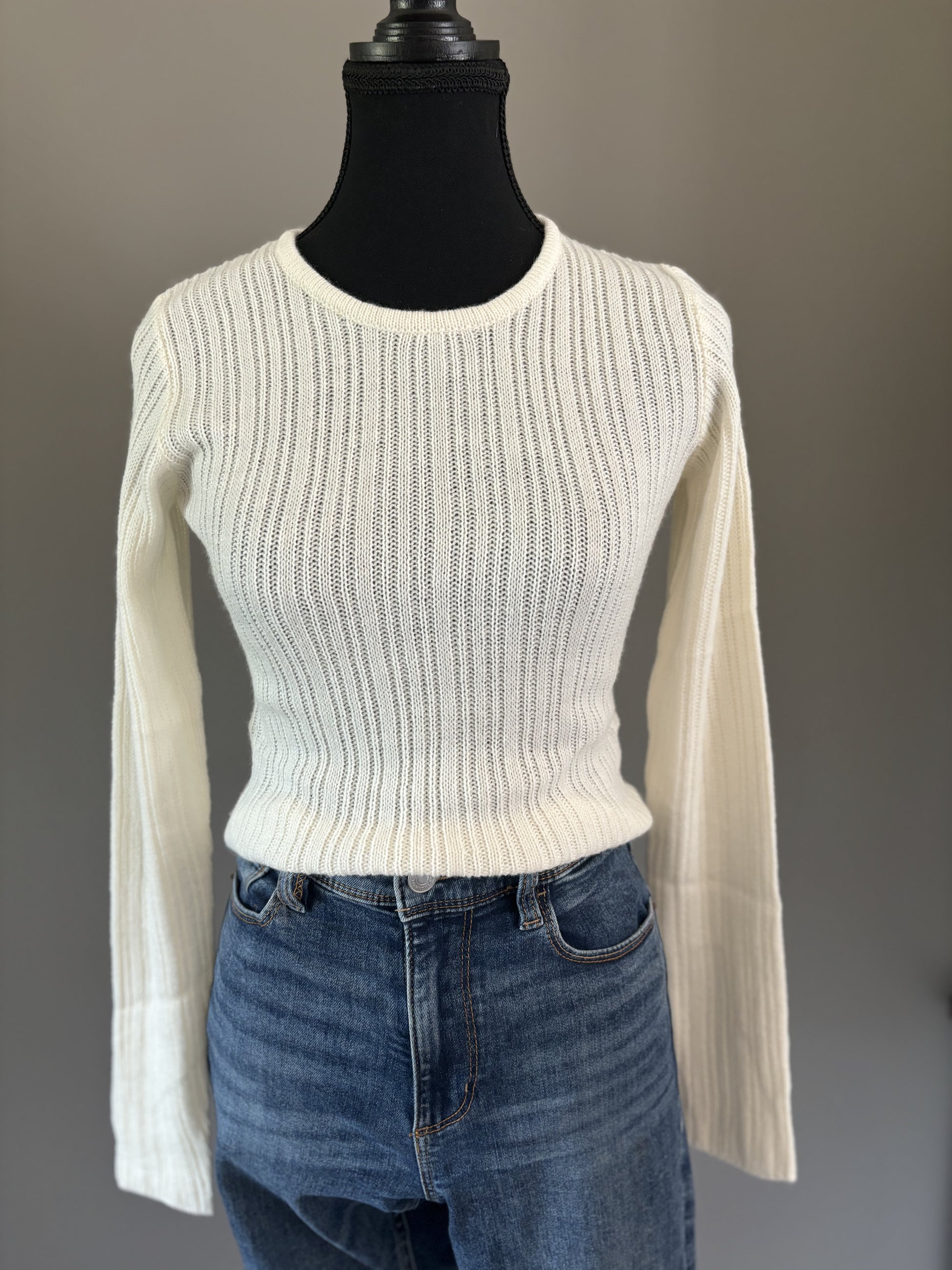 Made from 100% acrylic. The crewneck and slightly cropped design give it a modern and chic look, while the fitted silhouette adds a touch of sophistication. For a more relaxed fit, we recommend sizing up one size.
