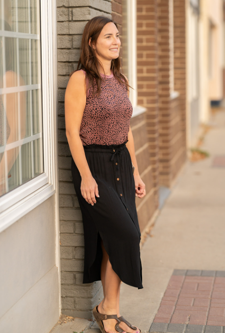 The Elm Skirt is a must-have for your wardrobe. Featuring a paper bag waist and button detail down the front, this mid-calf length skirt is perfect to wear with heels or booties. Crafted from a light weight material, it also features side slits for added style.