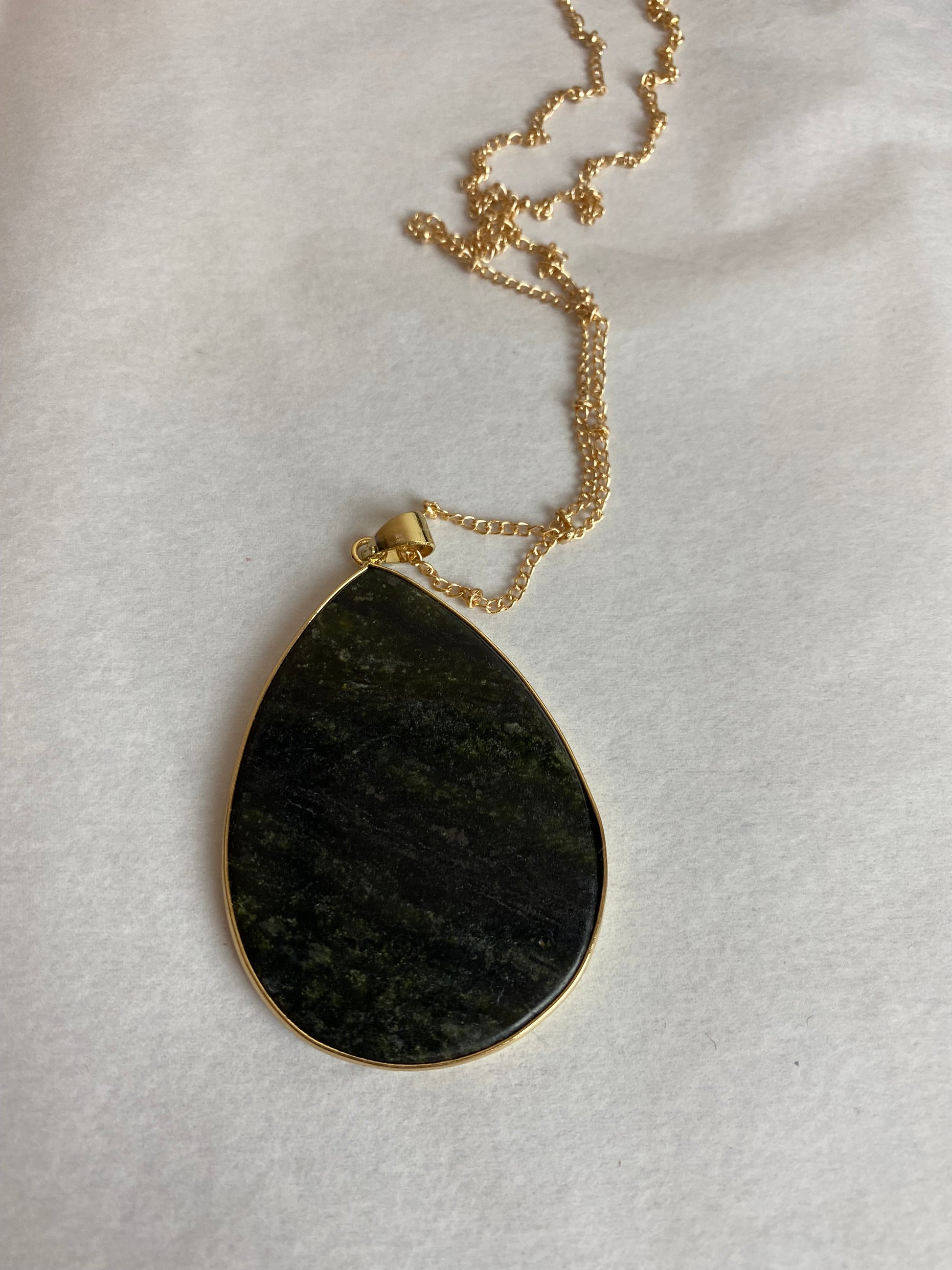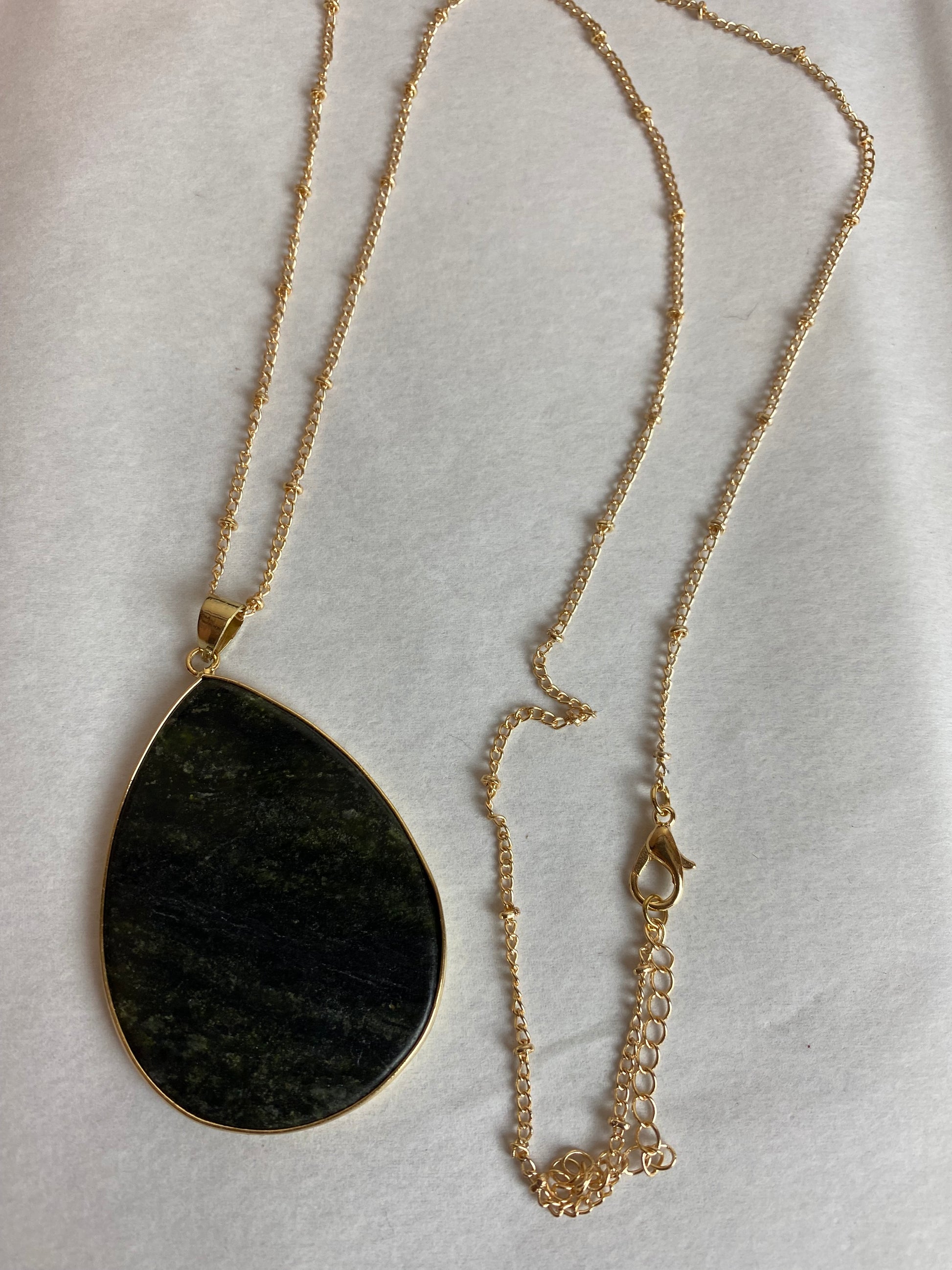 Beautiful black stone with slight white marbling throughout on a long gold colored chain. This beautiful necklace is simple and elegant. The perfect accessory for almost any outfit.