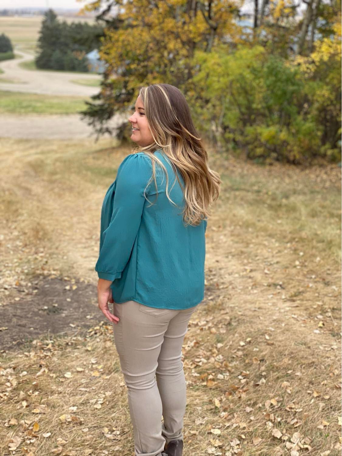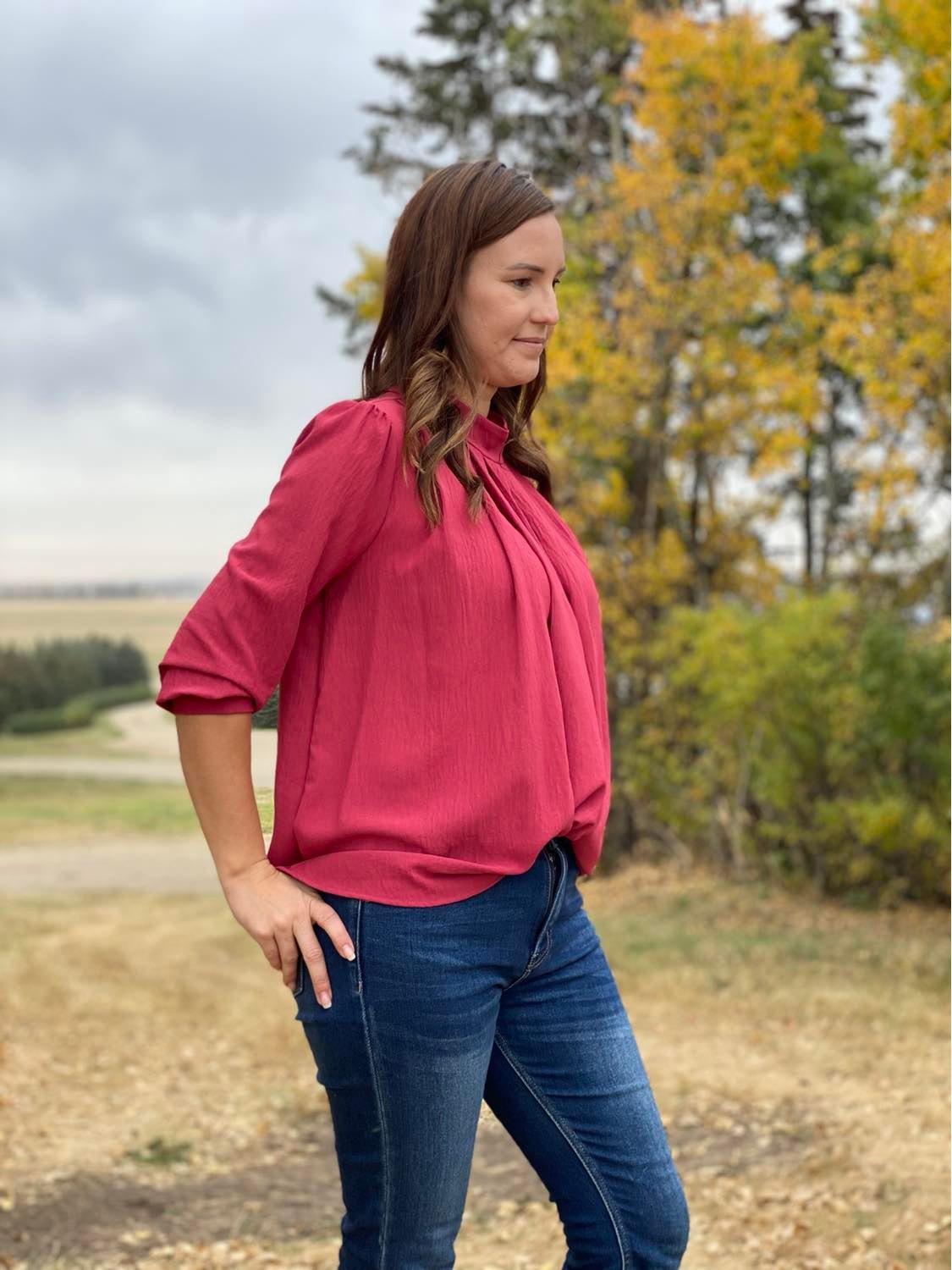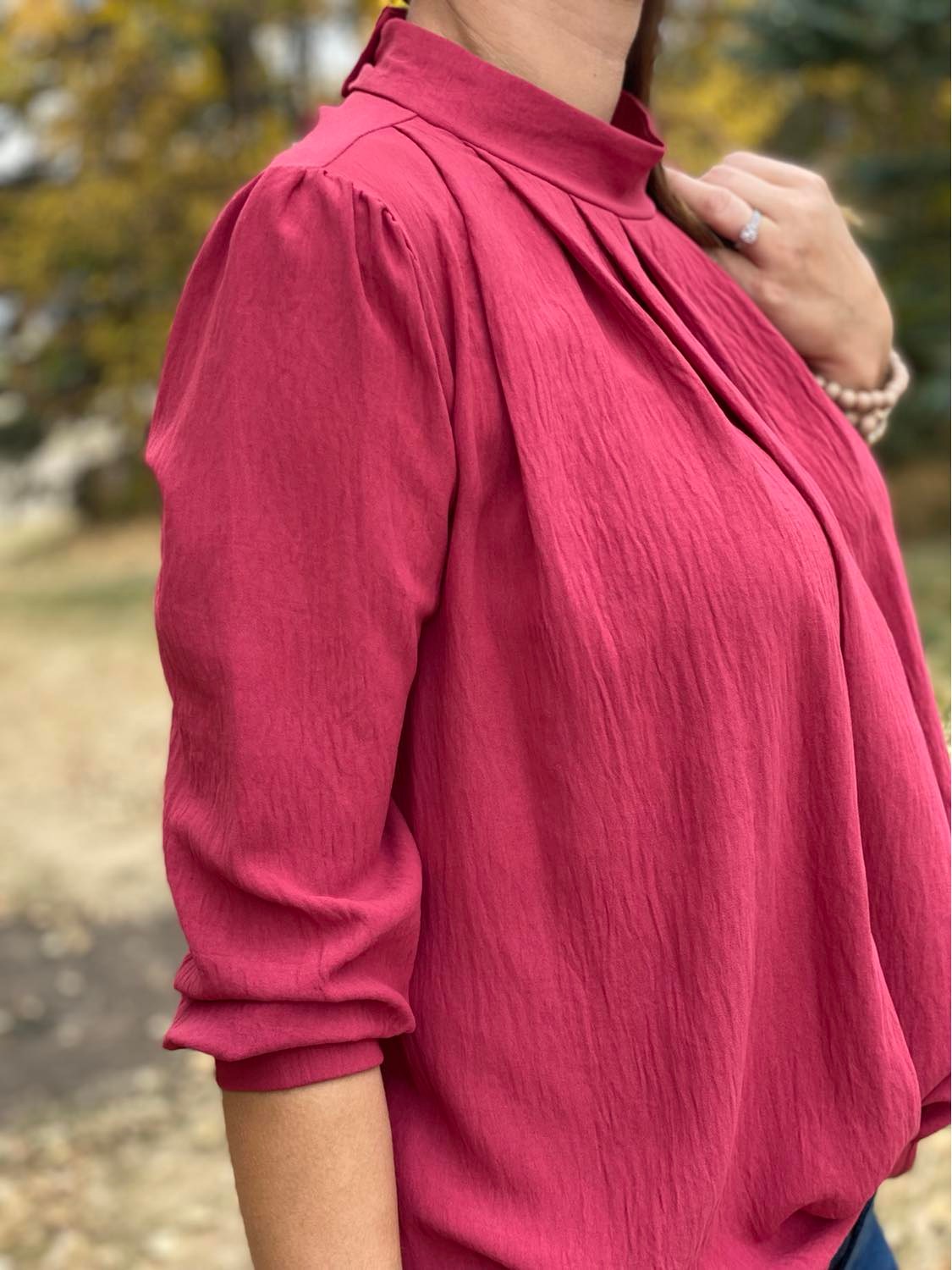 A flowey fitting shirt with a pleat detail at the neck and a banned Sleeve. Wear it untucked and flowing in with a cut pair of skinny jeans or half tucked with a jacket overtop.