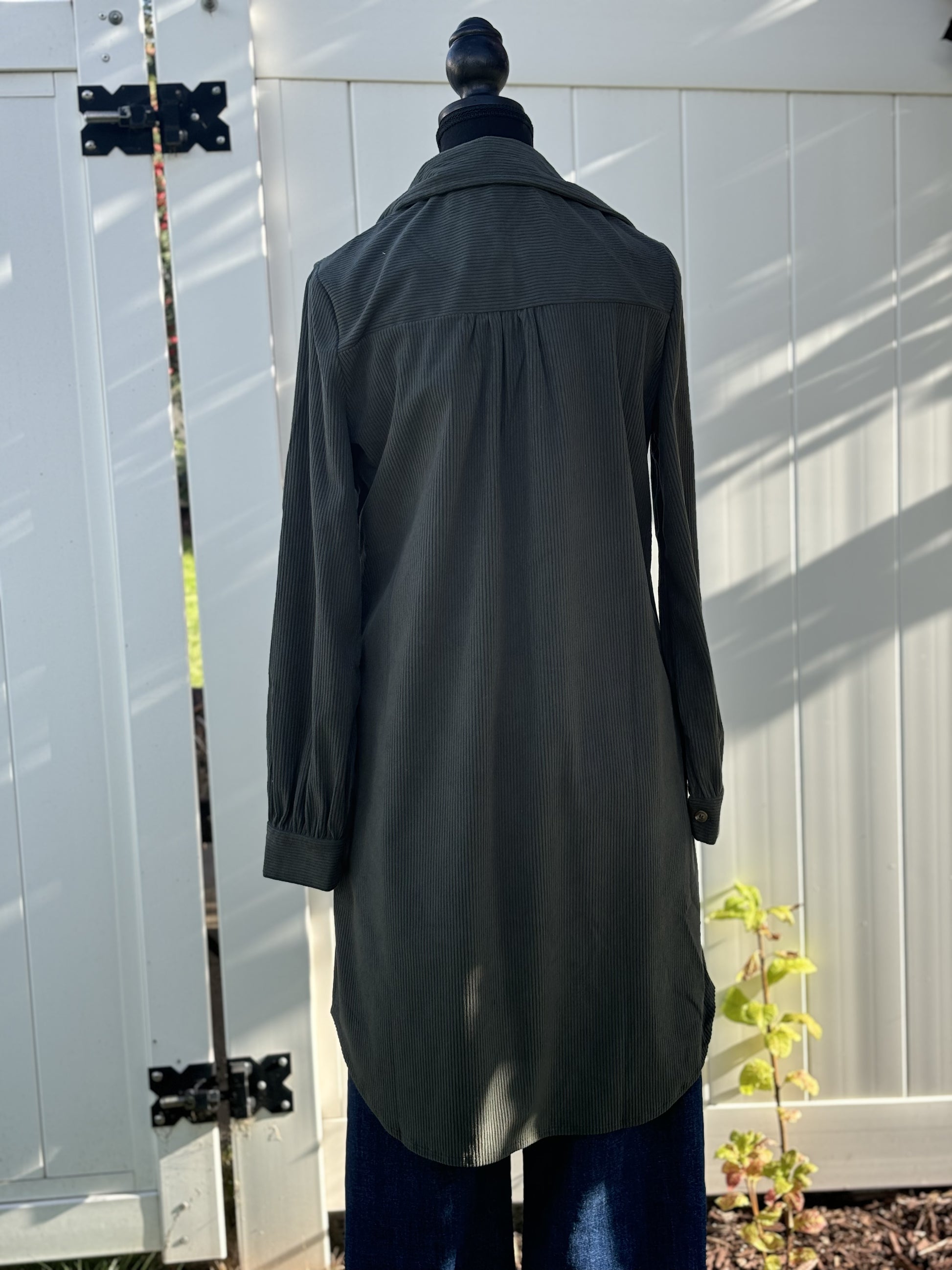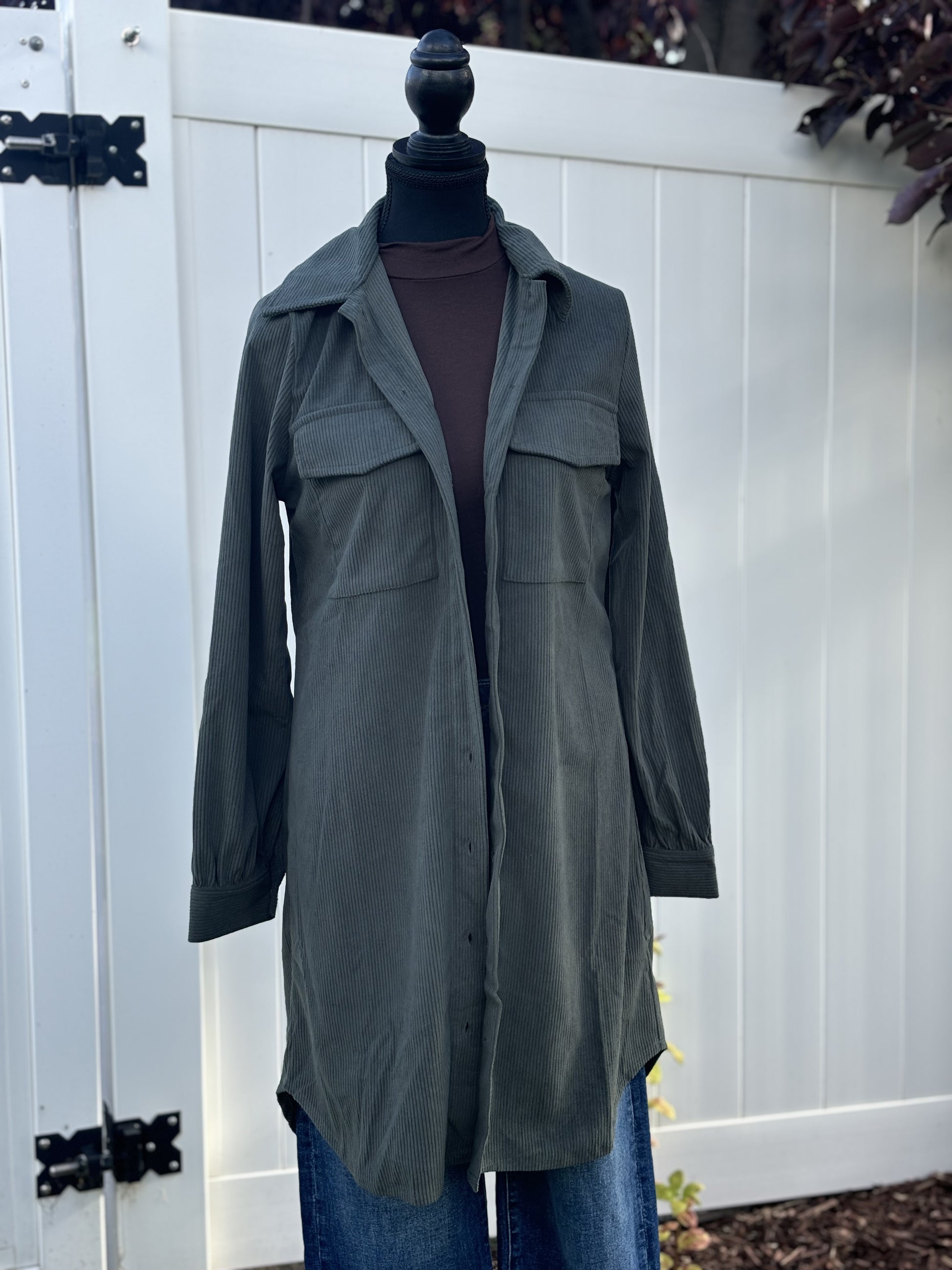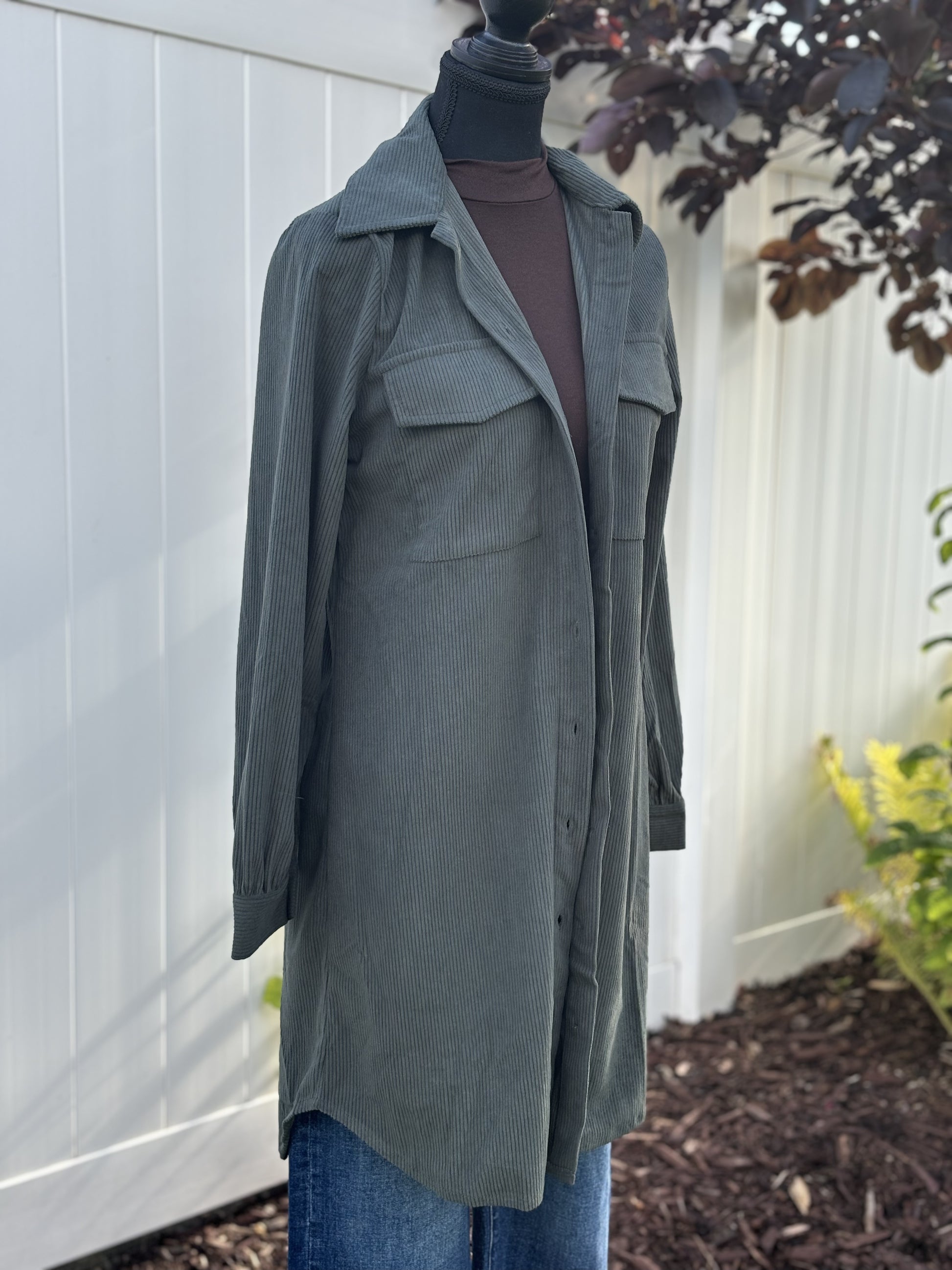 This stylish and versatile corduroy shirt dress is the perfect addition to your wardrobe. With knee length, it can be worn as a lightweight cardigan or closed with a belt and leggings for a casual winter dress. The soft corduroy material adds a touch of texture and warmth, making it a great choice for colder weather. The dress features a classic collar, button-down front, and long sleeves, giving it a timeless and sophisticated look. This dress is a must-have for any fashion-forward individual.