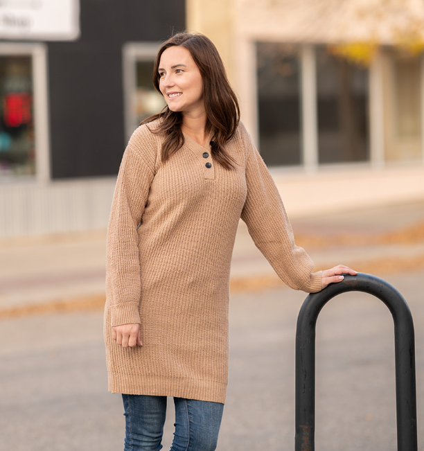 The Stacy Sweater Dress is a long tunic style garment, designed with a unique button detail at the neck. This dress is versatile and can be perfectly paired with leggings and tall boots or skinny jeans and booties.