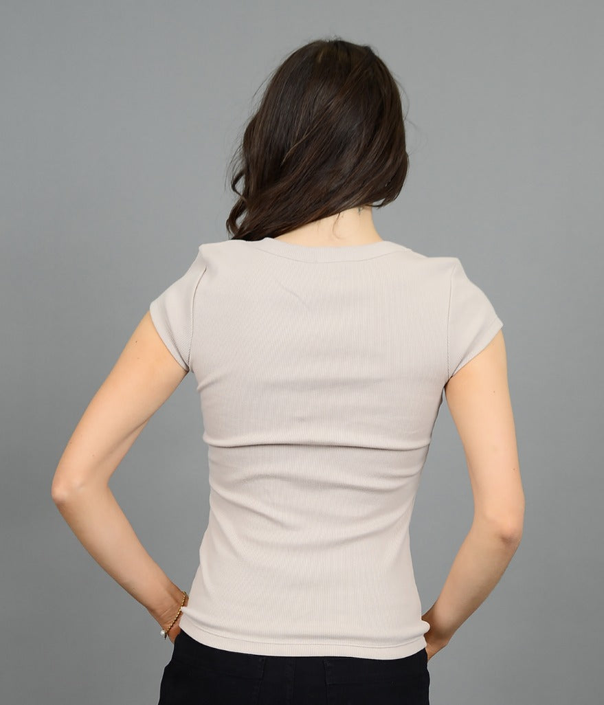 This ribbed t-shirt features a shorter length, making it the perfect casual piece for layering under a vest. Its lightweight and breathable fabric makes it ideal for those hot summer days. Whether you're running errands or lounging at home, the Tanya T-Shirt is the perfect choice for a comfortable and stylish look. Its versatile design allows you to dress it up or down, making it a staple for any occasion.