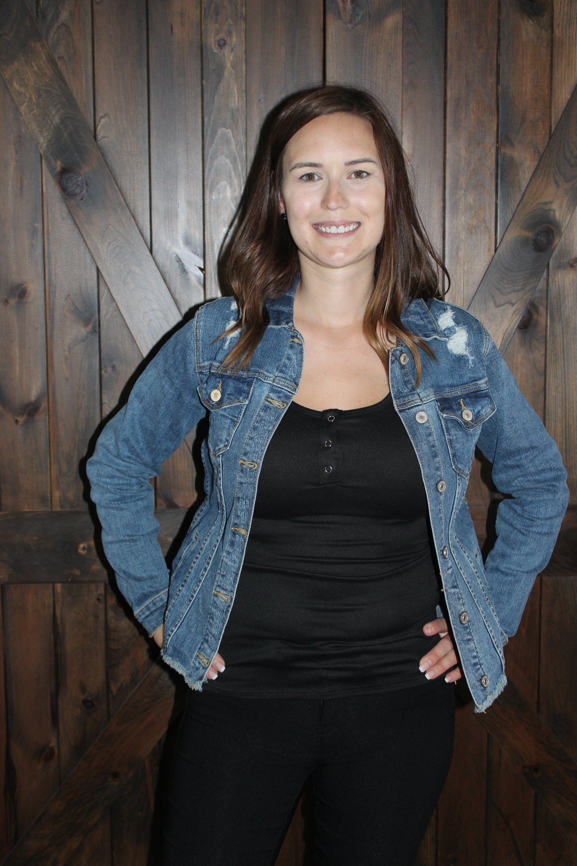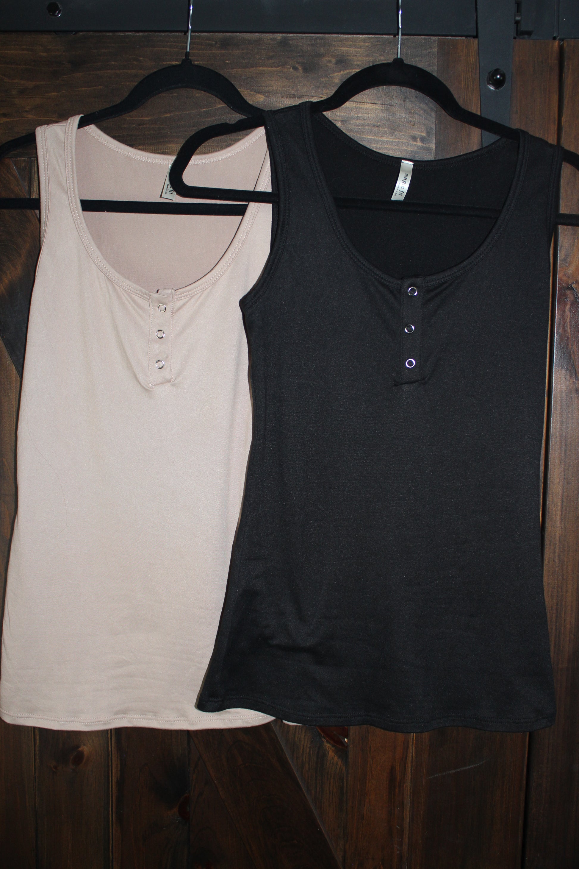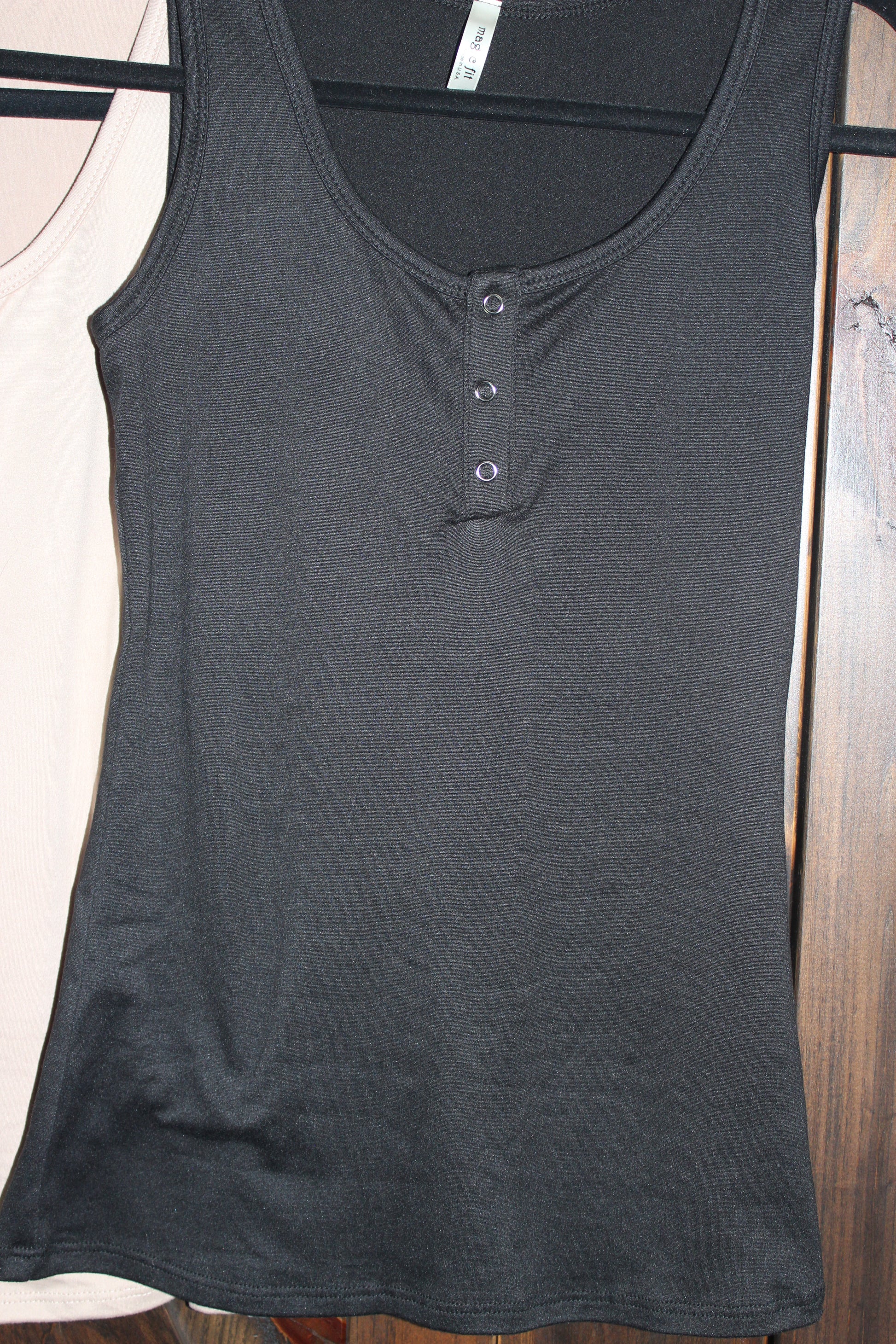 This is a simple fitted tank, with snap details in the front. Perfect for layering under jackets. It has a smaller fit, would recommend sizing up.