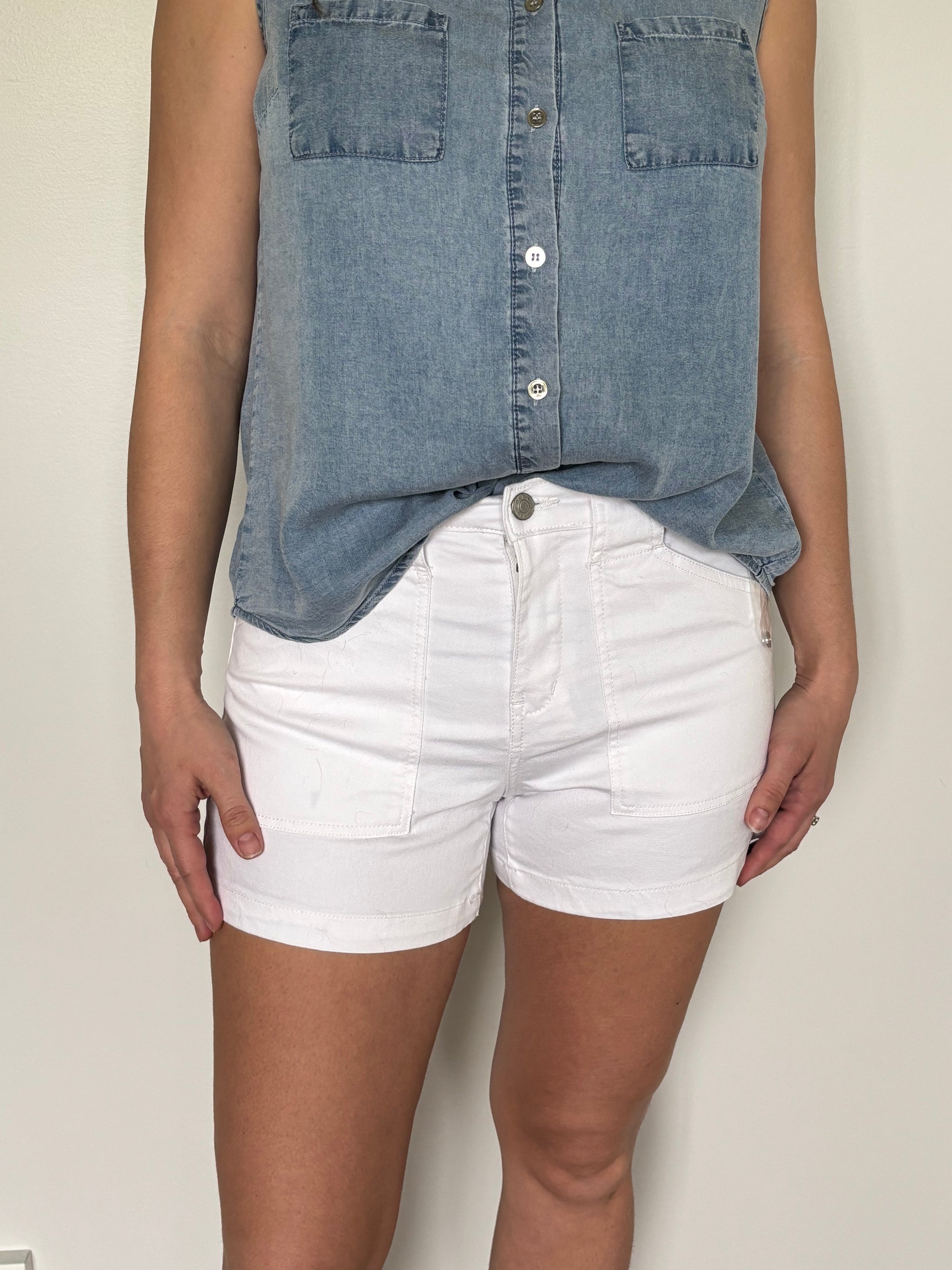 Step into summer with effortless style in our Seaside Breeze White Denim Shorts. These high-rise, structured shorts feature front patch pockets and a flattering tailored fit, perfect for beach days or casual brunches. Made with a soft yet durable stretch cotton blend, they offer both comfort and a polished look. Pair them with your favorite crop top or a breezy blouse for an elevated warm-weather outfit.